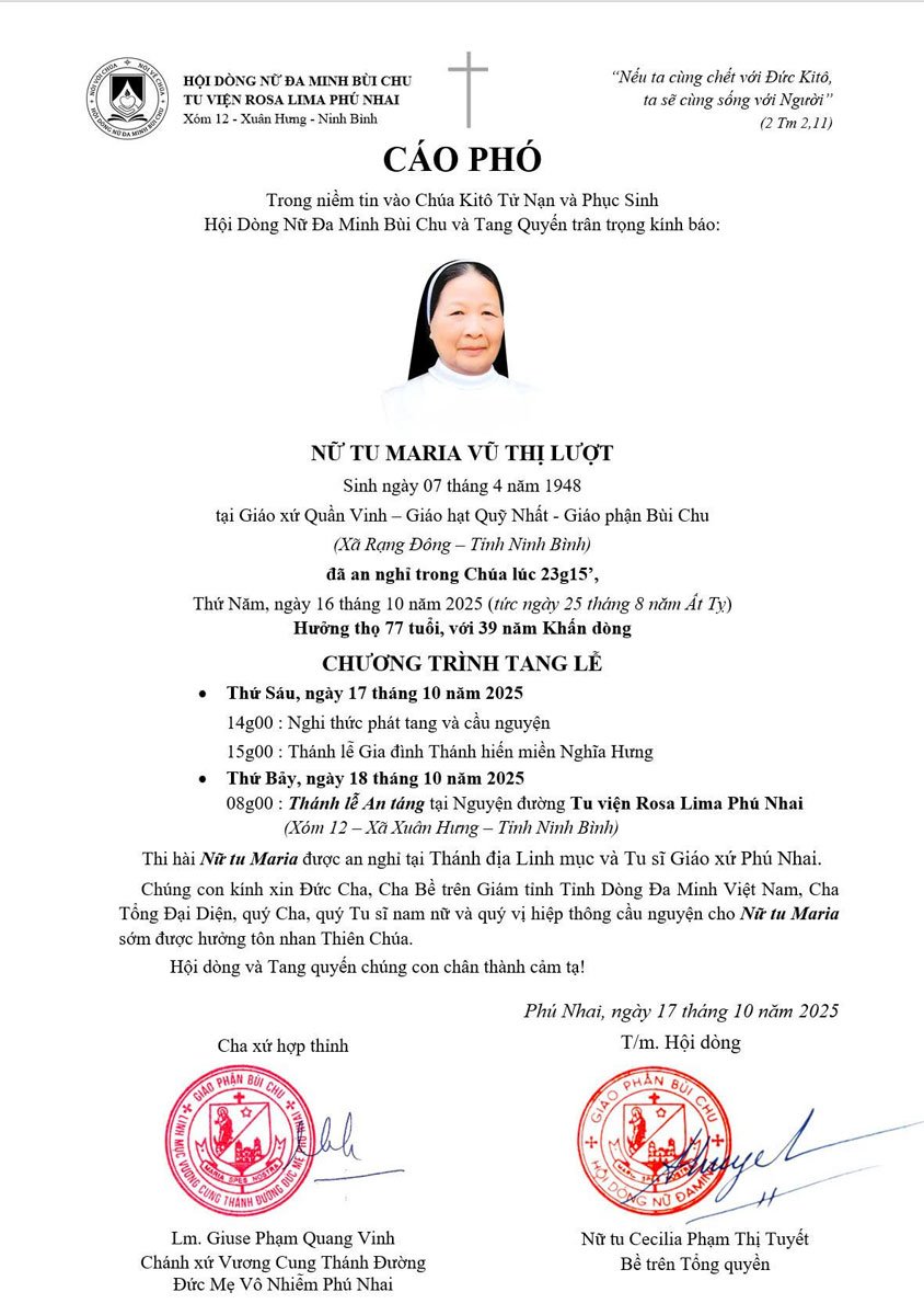 Cáo phó Nữ tu Maria Vũ Thị Lượt