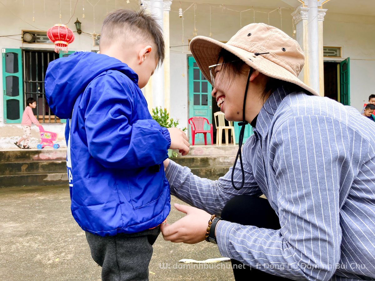 Lên đường với tâm thế “những người hành hương của hy vọng”, chúng tôi mong sẽ mang đến cho các em niềm “hy vọng”: hy vọng của bình an, của niềm vui và hạnh phúc… Các thành viên trong Mái ấm chào đón chúng tôi bằng những nụ cười đơn sơ, chất phác; thái độ hiền lành, thân thiện của mọi người nơi đây đã xoá tan đi không khí giá lạnh của những ngày đông. Sau màn chào hỏi đầy tiếng cười và niềm vui, chúng tôi bắt tay vào những công việc đã được lên chương trình với các nhóm khác nhau: nhóm cho các em ăn sáng, nhóm làm hang đá, nhóm nấu ăn cho buổi trưa. Thấy tinh thần hăng hái của chúng tôi, các em cũng chia ra nhiều tốp để phụ giúp: tốp phụ làm hang đá, tốp nhặt rau, tốp ngồi ngoan ngoãn để các chị đút cơm, tốp thì tạo tiếng cười bằng những hành động cực kỳ đáng yêu. v.v.