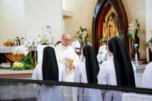 Vào ngày 24 tháng 3, quý Chị em trong Hội dòng hân hoan đón chào Đức Cha Giuse Ngô Quang Kiệt – Nguyên TGM Hà Nội, cùng quý Cha tới để hiệp dâng Thánh lễ vào lúc 10g00. Với các nữ tu Đa Minh Bùi Chu, đây chính là lời chúc mừng sớm mang đầy ý nghĩa và tình thương mến mà Đức tổng Giuse tặng cho Hội dòng nhân dịp mừng sinh nhật thứ 75. Và đây cũng chính là tâm tình tạ ơn Thiên Chúa mà Đức tổng, quý Cha và quý Chị em cùng hiệp lòng dâng lên Thiên Chúa vì tình thương của Ngài tuôn đổ trên Hội dòng suốt những năm tháng qua.