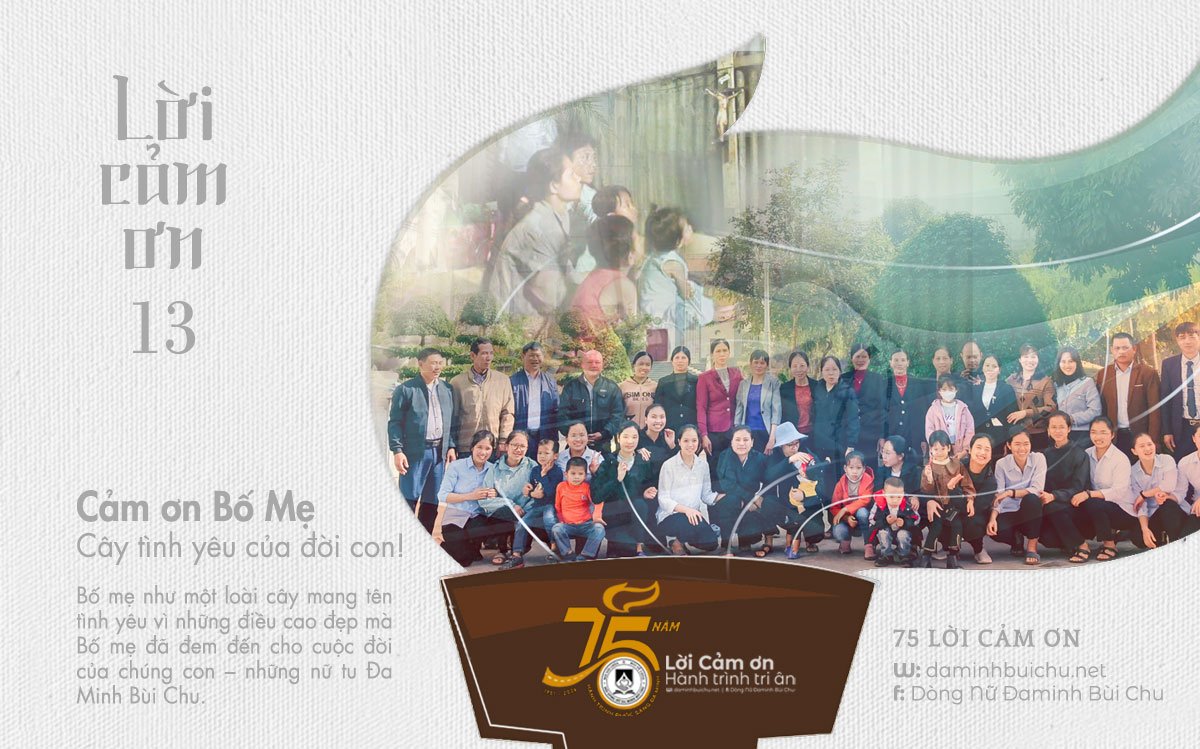 Chúng con biết rằng, chính tình yêu tròn đầy cùng tấm lòng quảng đại của Bố mẹ đã “sinh hoa kết trái” cho Hội dòng – những nữ tu Đa Minh Bùi Chu này. Vì thế, khi dâng lên Thiên Chúa lời tạ ơn vì hồng ân 75 năm, Hội dòng chúng con cũng nhớ đến ân nghĩa của quý Bố Mẹ. Nguyện xin Chúa ban muôn phúc lành xuống trên quý Bố mẹ, cho các ngài được hạnh phúc ở đời này và được hưởng phúc vinh muôn đời.