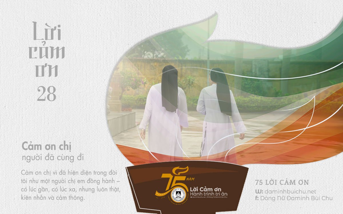 Nhân dịp Hội dòng mừng 75 năm thành lập, bên cạnh lời tạ ơn Chúa, tôi muốn gửi đến chị – một trong những người con của Hội dòng, lời cảm ơn chân thành. Cảm ơn chị vì đã hiện diện trong đời tôi như một người chị em đồng hành – có lúc gần, có lúc xa, nhưng luôn thật, kiên nhẫn và cảm thông. Cảm ơn chị vì đã cùng tôi đi qua những chặng đường quan trọng của đời tu, và vì đã góp phần làm cho hành trình ấy của tôi trở nên phong phú hơn, đẹp hơn và vững vàng hơn.