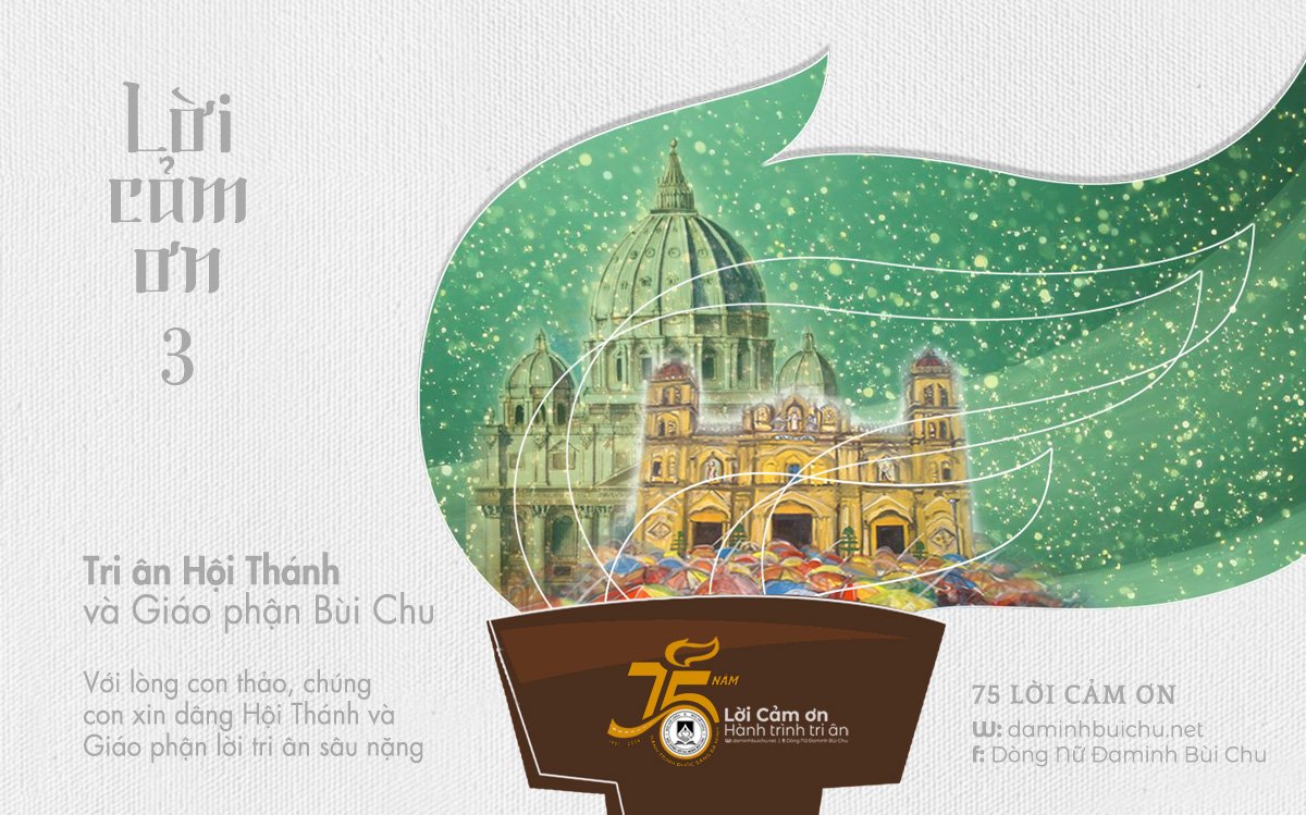 Đồng thời, chúng con cũng tri ân cách đặc biệt Giáo phận Bùi Chu – Hội Thánh địa phương, mảnh đất cội nguồn của Hội dòng. Nơi đây, Hội dòng chúng con đã được khai sinh, bén rễ và trưởng thành. Chính trong lòng Giáo phận, Hội dòng được bao bọc bởi tình hiệp thông huynh đệ, được nâng đỡ bởi tình thương của các vị chủ chăn, và được đồng hành bởi bao tâm hồn tín hữu.