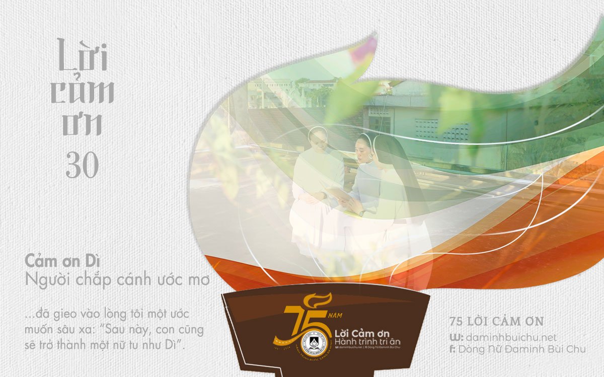 Nhân dịp kỷ niệm 75 năm thành lập Hội dòng, con xin gửi đến Dì những lời tri ân chân thành nhất: “Cảm ơn Dì – người đã đồng hành, nâng đỡ và khơi dậy trong con hạt giống ơn gọi. Cảm ơn Dì – vì đã chắp cánh cho ước mơ đời con bay cao trong tình yêu Thiên Chúa”. Qua Dì, hạt giống ơn gọi được gieo trong con đã nảy mầm, lớn lên và giờ đây đã trổ sinh hoa trái của đời hiến dâng. Con ước mong hạt giống ấy sẽ tiếp tục chết đi, để trổ sinh nhiều hoa trái hơn nữa cho cánh đồng của Chúa.