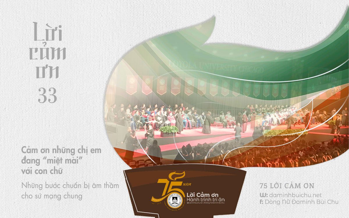Trong rất nhiều những sứ vụ, những con người được nhớ tới và được cảm ơn trong dấu mốc 75 năm hồng ân thành lập Hội dòng, xin được gửi lời cảm ơn chân thành đến những chị em đang ngày đêm miệt mài với những con chữ nơi các học đường, cách riêng là với những chị em đã can đảm nói lời xin vâng với sứ vụ học hành nơi phương trời xa.