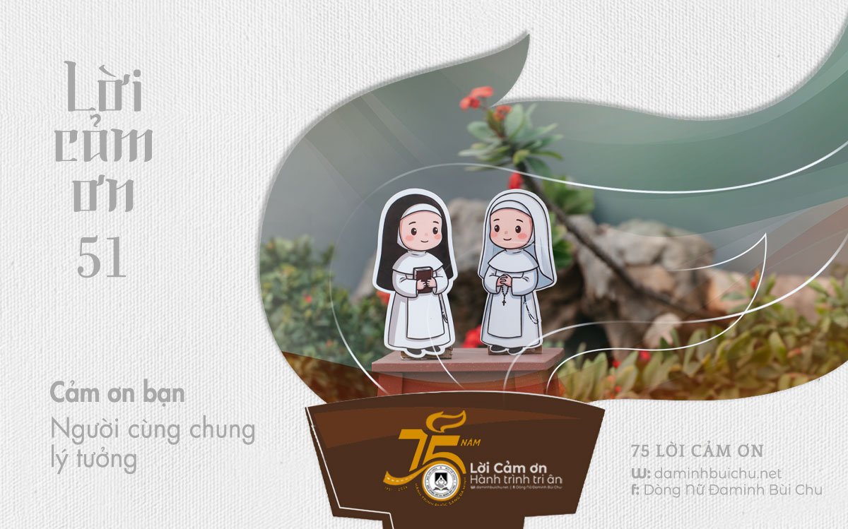 Nhìn lại chặng đường 75 năm của Hội dòng, tôi càng thêm trân quý những mối tương quan chị em thiêng liêng. Tạ ơn Chúa đã gửi đến cho tôi những người bạn tuyệt vời, trong đó có bạn. Tôi cũng tạ ơn Chúa đã ban cho tôi được là một phần của Hội dòng này. Tôi thấy mình thật may mắn khi cùng với những chị em khác trong Hội dòng được tiếp nối và kế thừa di sản thiêng liêng đó. Vì thế, tôi dâng lời tạ ơn Chúa cho tôi, cho bạn và cho cả Hội dòng chúng ta. Ước mong, biến cố kỷ niệm 75 năm sẽ là một cột mốc, một khởi điểm để mỗi thành viên trong Hội dòng tiếp tục biết cùng sống yêu thương và hiệp nhất trong tình yêu Chúa, để làm rạng danh Ngài mãi mãi.