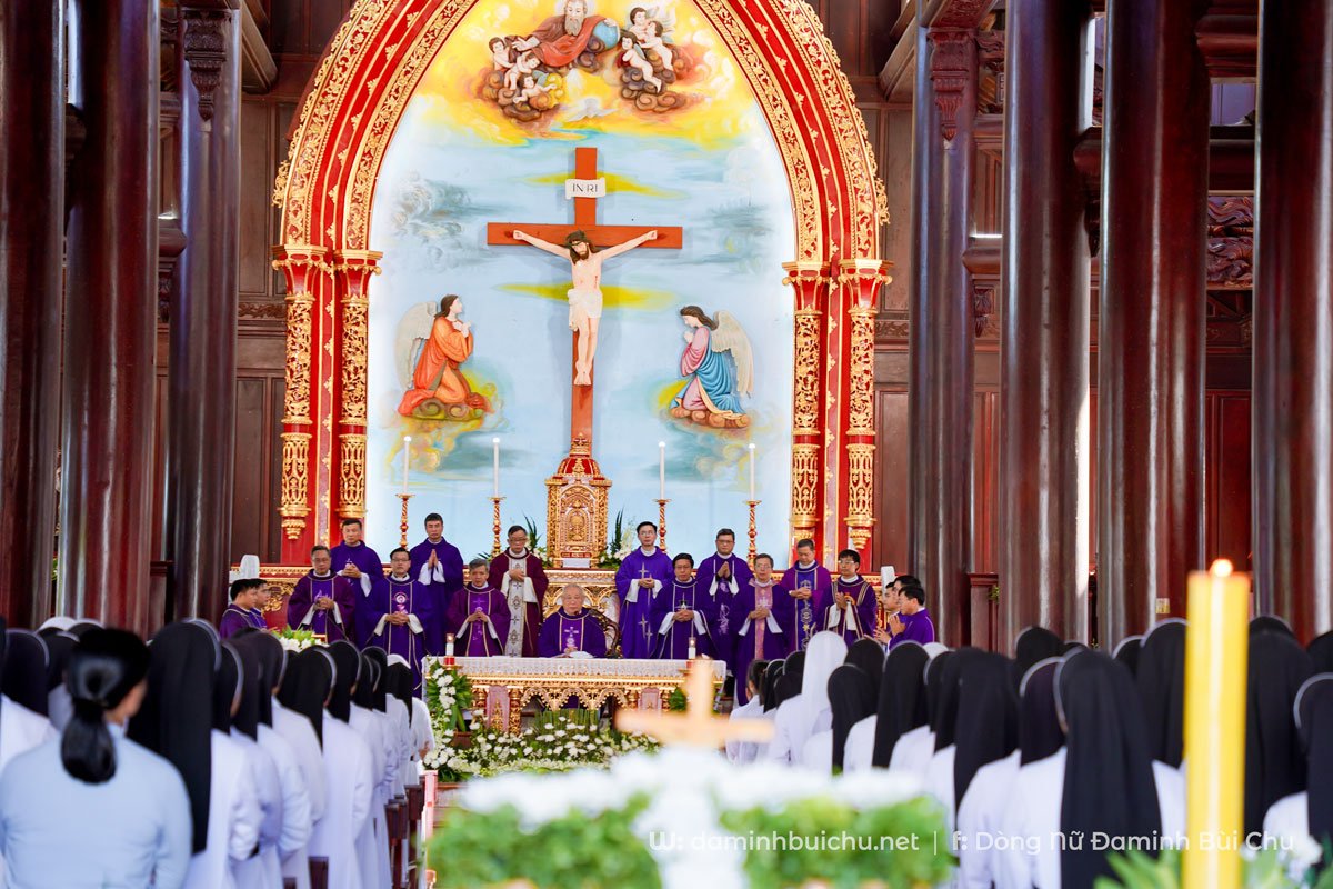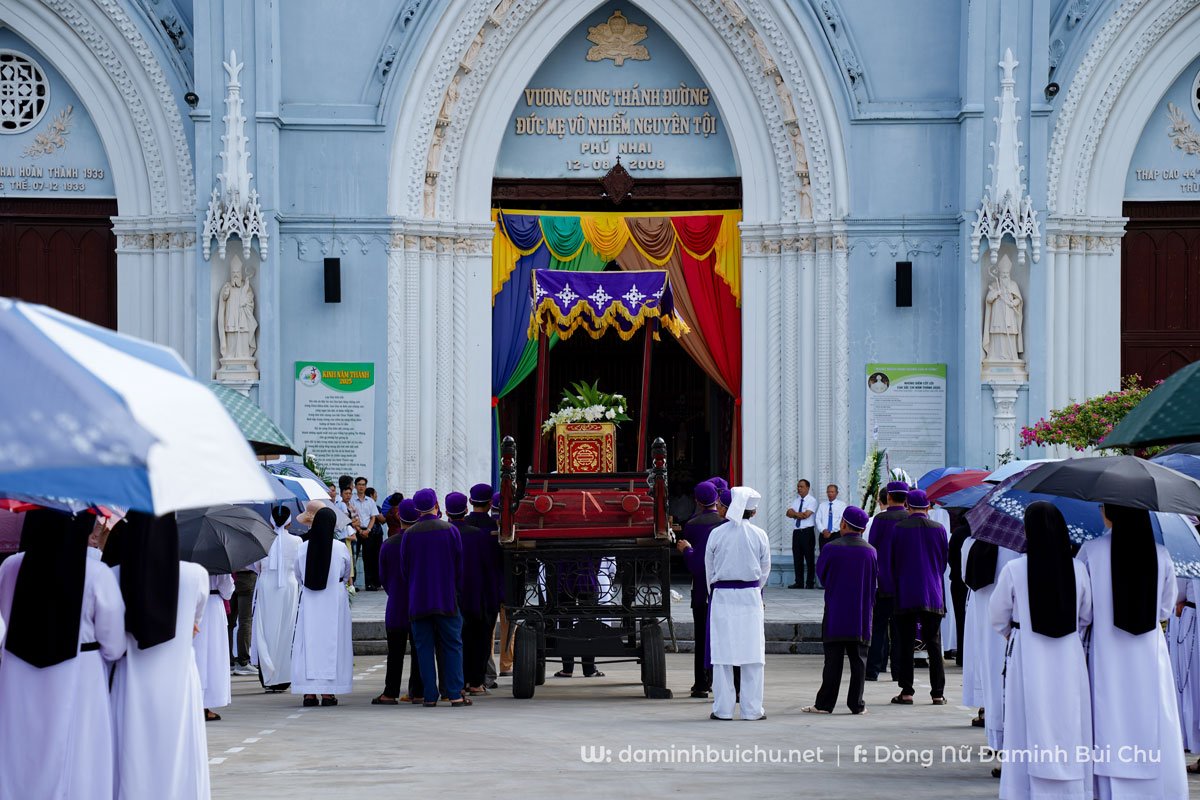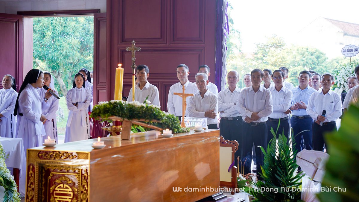Thánh lễ an táng do cha Giuse Phạm Quang Vinh – quản hạt, chánh xứ Vương cung Thánh đường Đức Mẹ Vô Nhiễm Phú Nhai chủ tế và quý Cha đồng tế. Tham dự thánh lễ, có sự hiện diện của quý Chị em trong Hội dòng, quý Tu sĩ, quý bà con thân quyến, quý Cộng đoàn đại diện của Giáo xứ Long Châu, Giáo xứ Quần Vinh, cùng quý Hội đoàn và bà con Giáo xứ Vương cung Thánh đường Đức Mẹ Vô Nhiễm Phú Nhai.