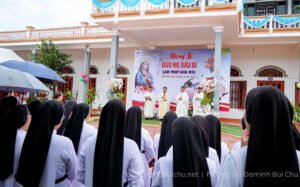 Sau đó, cộng đoàn cung nghinh Thánh giá và tượng Đức Mẹ Sầu Bi tiến về thánh đường. Tiếng hát và bước chân sốt mến như nhắc nhớ mọi người cùng Mẹ Maria bước theo Con trên hành trình Thập giá – hành trình tình yêu và hiến dâng.